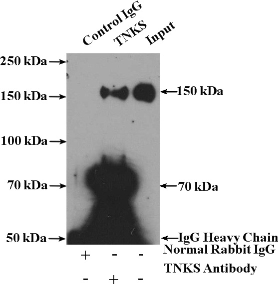 IP Result of anti-TNKS (IP:Catalog No:116147, 4ug; Detection:Catalog No:116147 1:500) with Jurkat cells lysate 3200ug.