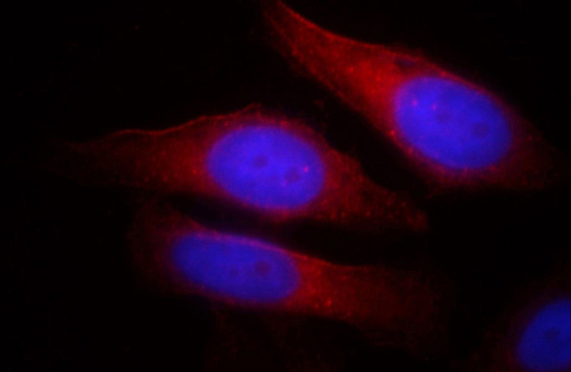 Immunofluorescent analysis of HepG2 cells, using TNKS antibody Catalog No:116147 at 1:25 dilution and Rhodamine-labeled goat anti-rabbit IgG (red). Blue pseudocolor = DAPI (fluorescent DNA dye).