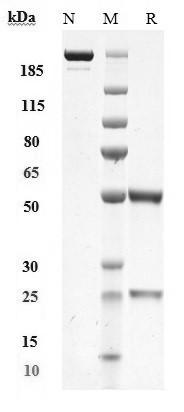 Anti-TLR2 / CD282 Antibody (tomaralimab) on SDS-PAGE under reducing (R) condition. The purity of the protein is greater than 95%.