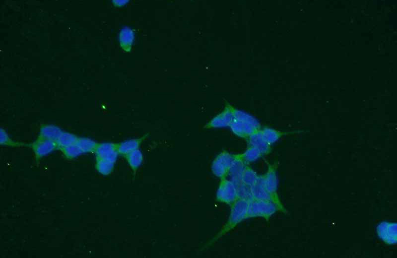 Immunofluorescent analysis of HEK-293 cells using Catalog No:116208(TPMT Antibody) at dilution of 1:50 and Alexa Fluor 488-congugated AffiniPure Goat Anti-Rabbit IgG(H+L)