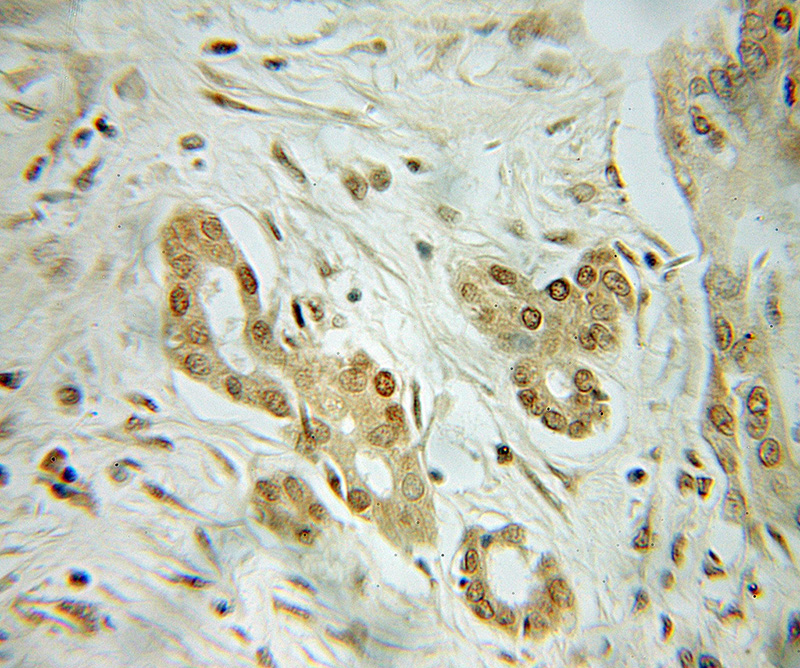 Immunohistochemical of paraffin-embedded human pancreas cancer using Catalog No:116232(TRAF4 antibody) at dilution of 1:50 (under 10x lens)