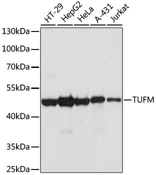 Western blot analysis of extracts of various cell lines, using TUFM antibody at 1:1000 dilution.Secondary antibody: HRP Goat Anti-Rabbit IgG (H+L) at 1:10000 dilution.Lysates/proteins: 25ug per lane.Blocking buffer: 3% nonfat dry milk in TBST.Detection: ECL Basic Kit .Exposure time: 90s.
