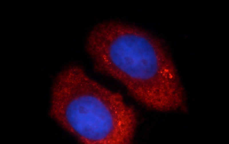 Immunofluorescent analysis of HepG2 cells, using UBE2C antibody Catalog No: at 1:25 dilution and Rhodamine-labeled goat anti-mouse IgG (red).