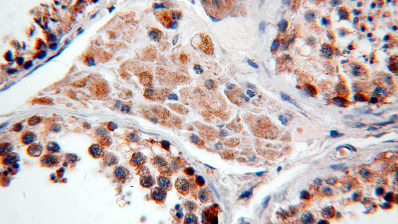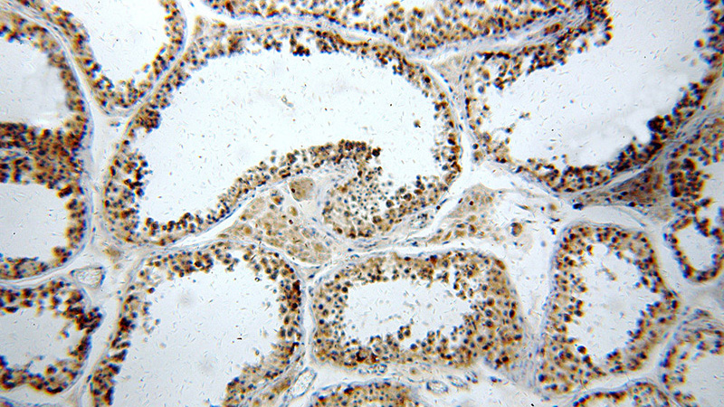 Immunohistochemical of paraffin-embedded human testis using Catalog No:116690(USP50 antibody) at dilution of 1:50 (under 40x lens)