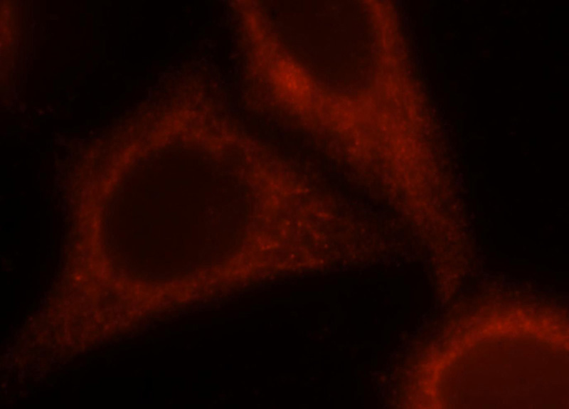 Immunofluorescent analysis of HepG2 cells, using UVRAG antibody Catalog No:116699 at 1:25 dilution and Rhodamine-labeled goat anti-rabbit IgG (red).