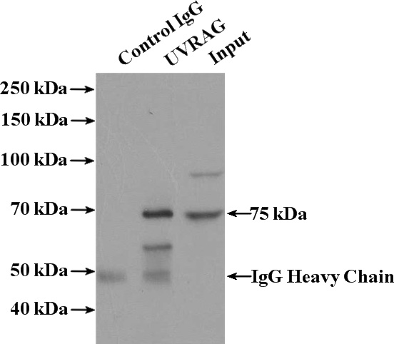 UVRAG Rabbit Polyclonal antibody. Positive IF detected in HepG2 cells. Positive IP detected in mouse liver tissue. Positive WB detected in HepG2 cells, HEK-293 cells, human brain tissue, mouse liver tissue. Observed molecular weight by Western-blot: 75-85 kDa