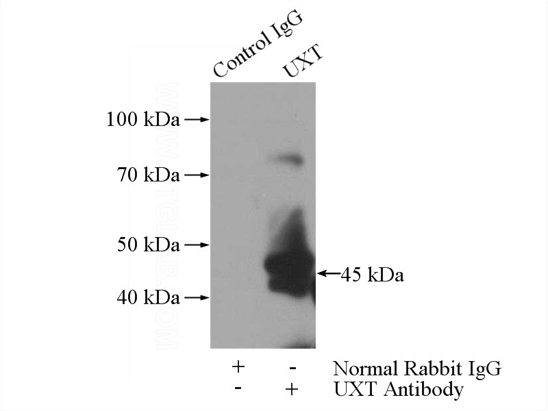UXT Rabbit Polyclonal antibody. Positive IP detected in mouse brain tissue. Positive WB detected in HeLa cells, mouse brain tissue. Observed molecular weight by Western-blot: 18, 45 kDa