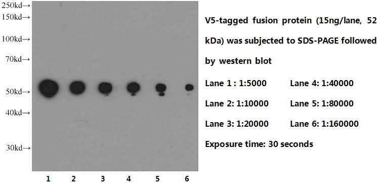 Western blot of V5-tagged fusion protein with V5 tag monoclonal antibody (Catalog No:117343) at various dilutions.