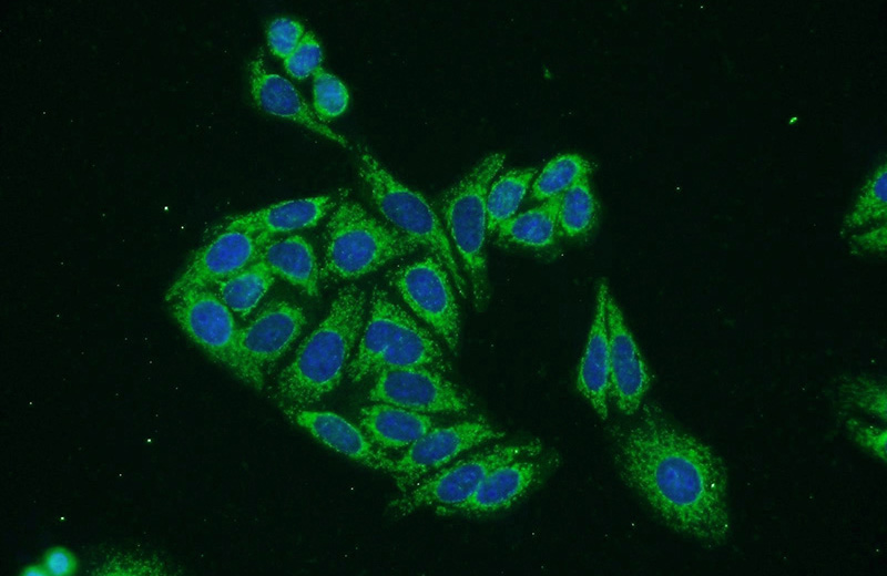 Immunofluorescent analysis of HepG2 cells using Catalog No:116712(VANGL2 Antibody) at dilution of 1:50 and Alexa Fluor 488-congugated AffiniPure Goat Anti-Rabbit IgG(H+L)