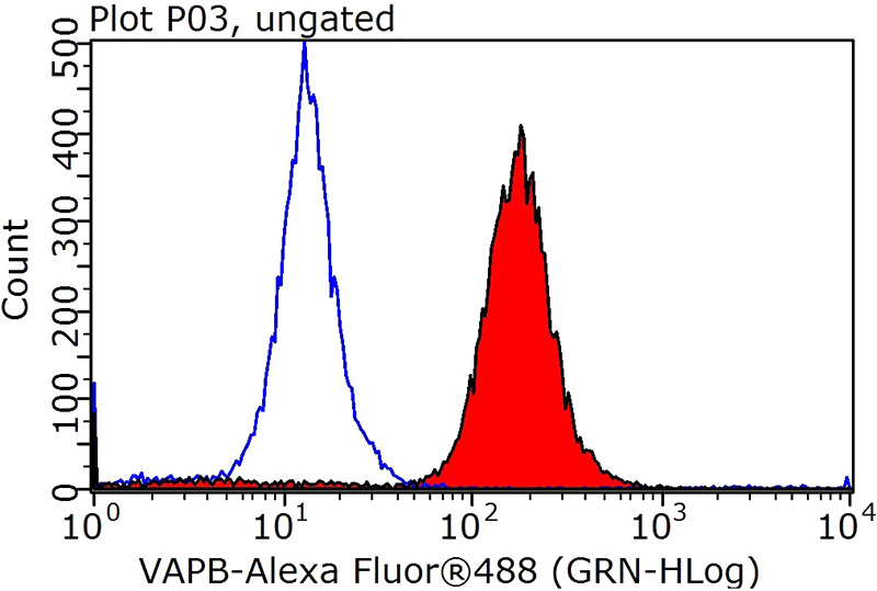 1X10^6 HepG2 cells were stained with 0.2ug VAPB antibody (Catalog No:116715, red) and control antibody (blue). Fixed with 90% MeOH blocked with 3% BSA (30 min). Alexa Fluor 488-congugated AffiniPure Goat Anti-Rabbit IgG(H+L) with dilution 1:1000.
