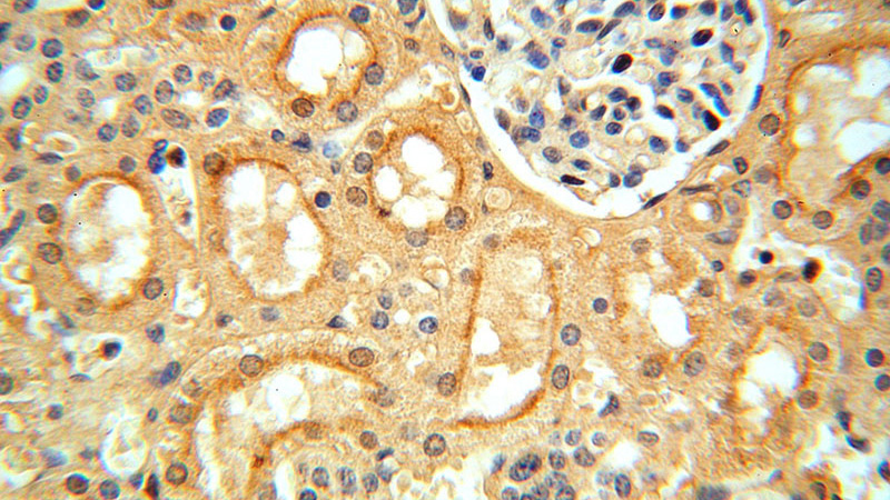Immunohistochemical of paraffin-embedded human kidney using Catalog No:116721(VAV1 antibody) at dilution of 1:50 (under 40x lens)