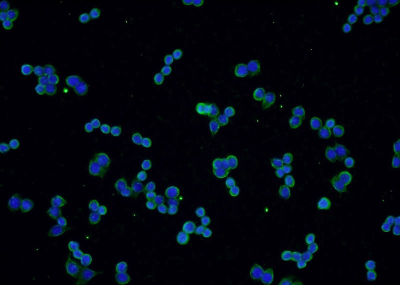 Immunofluorescent analysis of RAW 264.7 cells using Catalog No:107538(VCP Antibody) at dilution of 1:50 and Alexa Fluor 488-congugated AffiniPure Goat Anti-Mouse IgG(H+L)