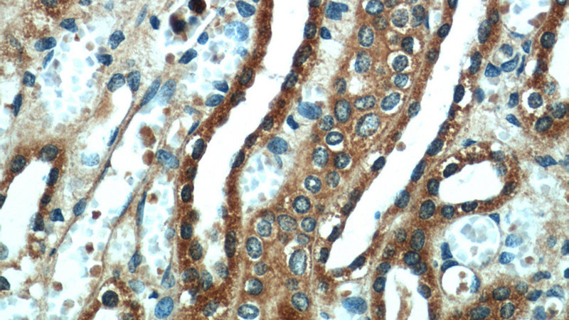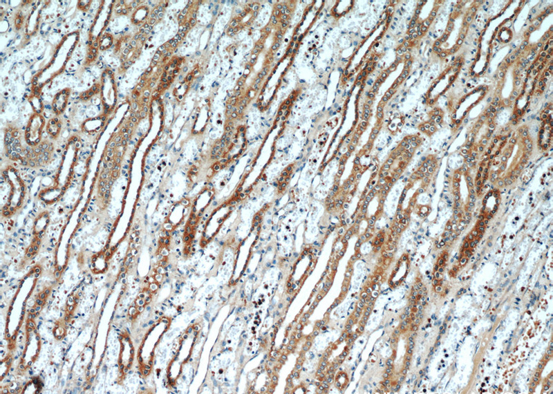 Immunohistochemical of paraffin-embedded human kidney using Catalog No:116731(VDAC2 antibody) at dilution of 1:50 (under 40x lens)