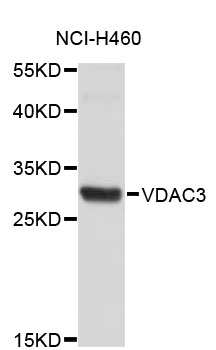 Western blot analysis of extracts of NCI-H460 cells, using VDAC3 antibody .Secondary antibody: HRP Goat Anti-Rabbit IgG (H+L) at 1:10000 dilution.Lysates/proteins: 25ug per lane.Blocking buffer: 3% nonfat dry milk in TBST.
