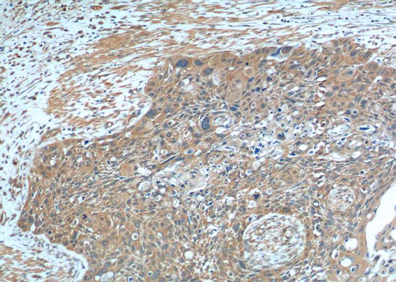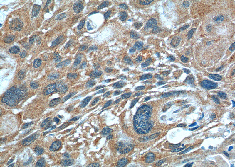 Immunohistochemistry of paraffin-embedded human oesophagus cancer tissue slide using Catalog No:116736(KDR Antibody) at dilution of 1:200 (under 40x lens).
