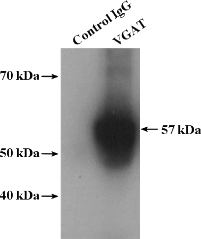VGAT Rabbit Polyclonal antibody. Positive IP detected in mouse brain tissue. Positive WB detected in mouse brain tissue. Observed molecular weight by Western-blot: 57 kDa