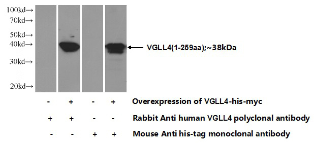 VGLL4 Rabbit Polyclonal antibody. Positive WB detected in Transfected HEK-293 cells.