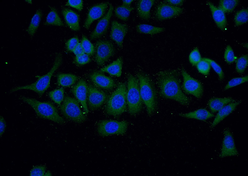 Immunofluorescent analysis of (-20oc Ethanol) fixed HeLa cells using Catalog No:116751(VSNL1 Antibody) at dilution of 1:25 and Alexa Fluor 488-congugated AffiniPure Goat Anti-Rabbit IgG(H+L)