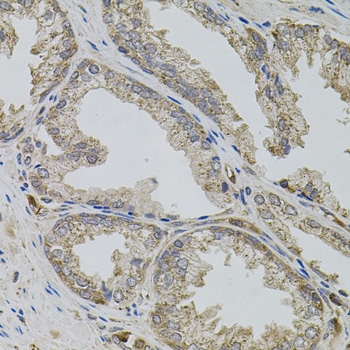 Immunohistochemistry of paraffin-embedded human prostate using VIP antibody (40x lens).