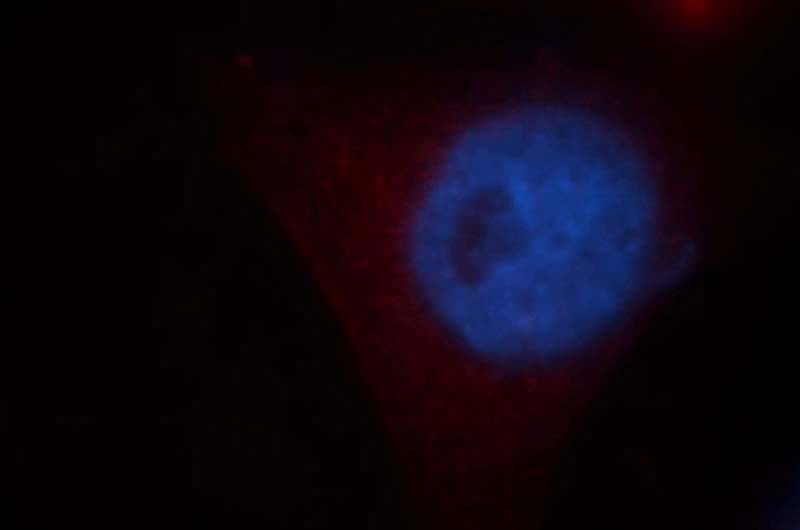 Immunofluorescent analysis of HepG2 cells, using VPS11 antibody Catalog No:116770 at 1:25 dilution and Rhodamine-labeled goat anti-rabbit IgG (red). Blue pseudocolor = DAPI (fluorescent DNA dye).