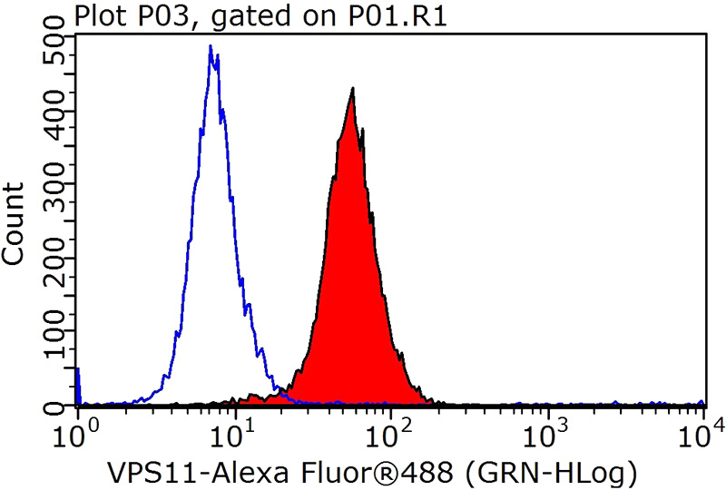 1X10^6 HepG2 cells were stained with 0.2ug VPS11 antibody (Catalog No:116770, red) and control antibody (blue). Fixed with 90% MeOH blocked with 3% BSA (30 min). Alexa Fluor 488-congugated AffiniPure Goat Anti-Rabbit IgG(H+L) with dilution 1:1000.
