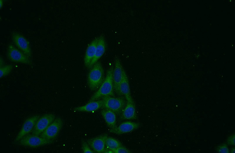 Immunofluorescent analysis of HepG2 cells using Catalog No:116771(VPS13B Antibody) at dilution of 1:25 and Alexa Fluor 488-congugated AffiniPure Goat Anti-Rabbit IgG(H+L)