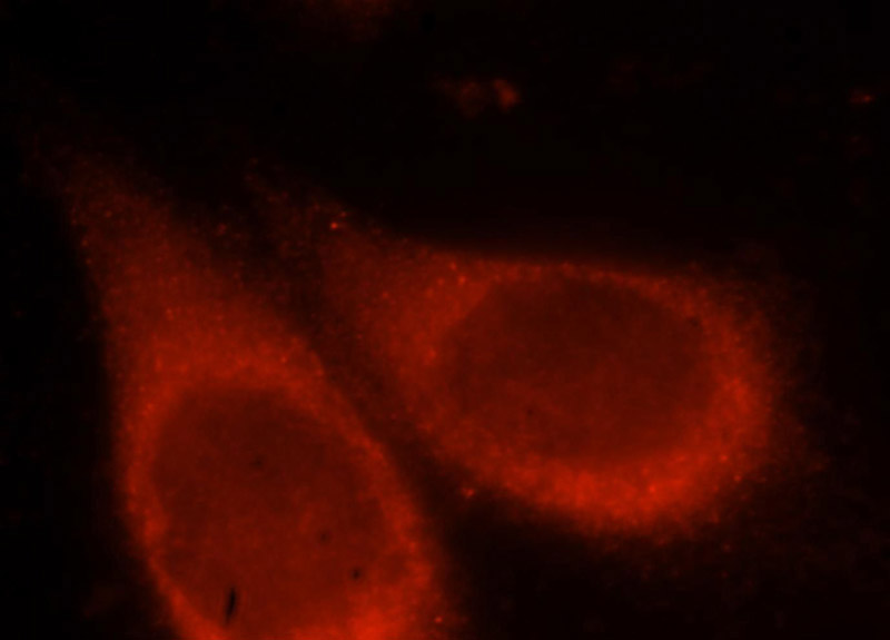 Immunofluorescent analysis of Hela cells, using PIK3R4 antibody Catalog No:116772 at 1:25 dilution and Rhodamine-labeled goat anti-rabbit IgG (red).