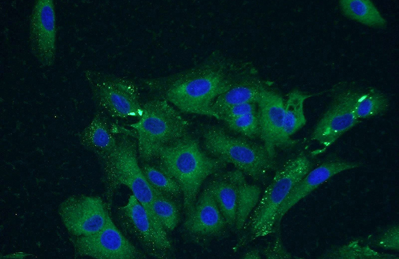 Immunofluorescent analysis of A549 cells using Catalog No:116774(VPS18 Antibody) at dilution of 1:50 and Alexa Fluor 488-congugated AffiniPure Goat Anti-Rabbit IgG(H+L)