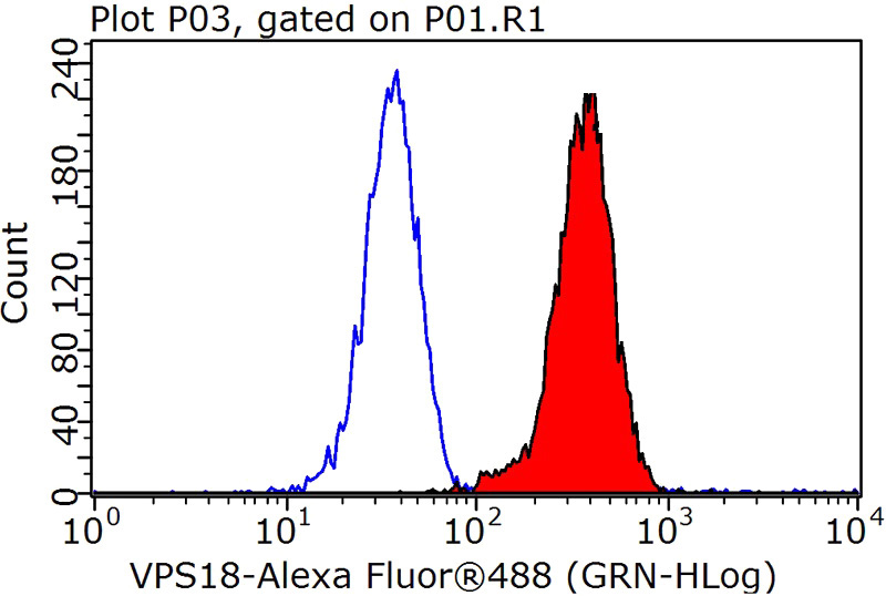 1X10^6 K-562 cells were stained with 0.2ug VPS18 antibody (Catalog No:116774, red) and control antibody (blue). Fixed with 90% MeOH blocked with 3% BSA (30 min). Alexa Fluor 488-congugated AffiniPure Goat Anti-Rabbit IgG(H+L) with dilution 1:1000.