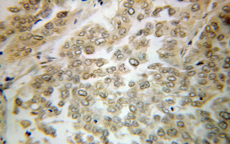 Immunohistochemical of paraffin-embedded human lung cancer using Catalog No:116774(VPS18 antibody) at dilution of 1:100 (under 10x lens)
