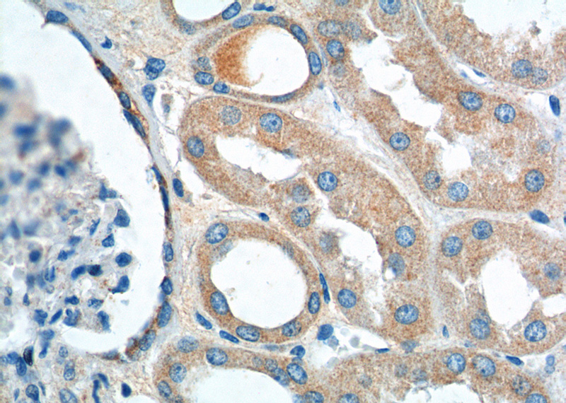 Immunohistochemistry of paraffin-embedded human kidney tissue slide using Catalog No:116777(VPS26A Antibody) at dilution of 1:200 (under 40x lens).