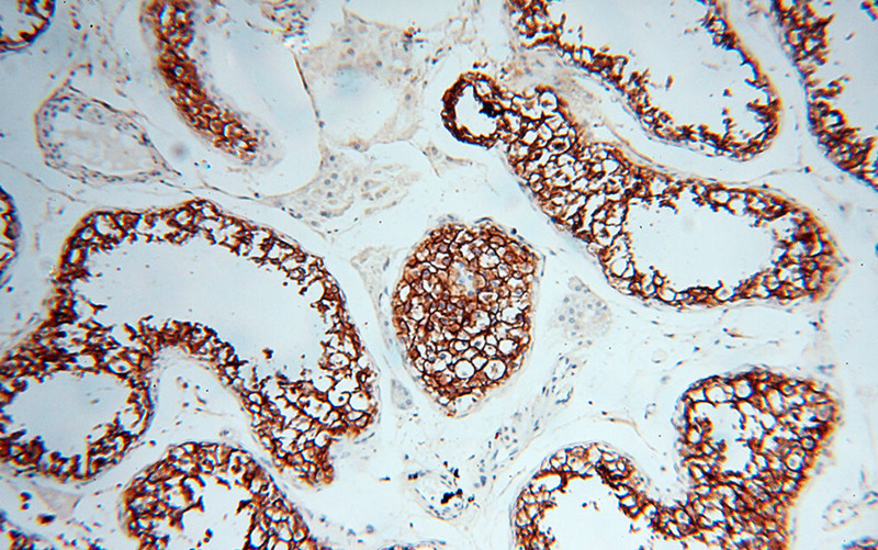 Immunohistochemical of paraffin-embedded human testis using Catalog No:116800(VSIG1 antibody) at dilution of 1:100 (under 10x lens)