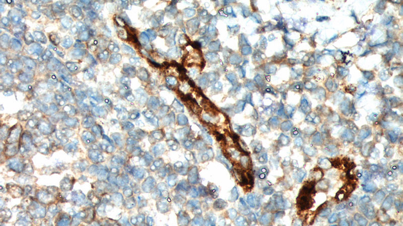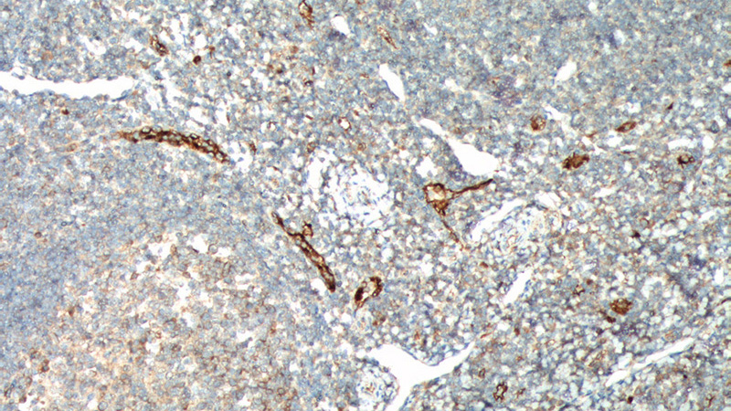 Immunohistochemistry of paraffin-embedded human tonsillitis tissue slide using Catalog No:116811(VWF, VWFpp Antibody) at dilution of 1:200 (under 40x lens).