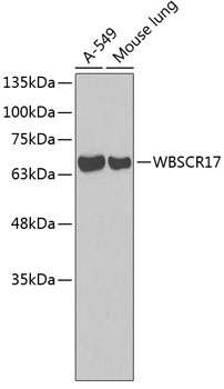 Western blot analysis of extracts of various cell lines, using WBSCR17 antibody .Secondary antibody: HRP Goat Anti-Rabbit IgG (H+L) at 1:10000 dilution.Lysates/proteins: 25ug per lane.Blocking buffer: 3% nonfat dry milk in TBST.