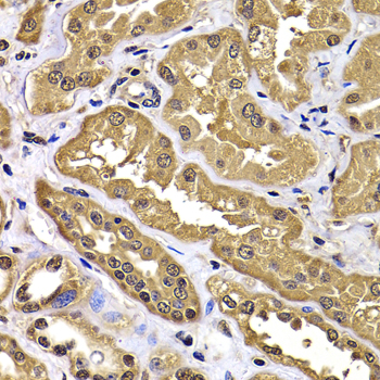 Immunohistochemistry of paraffin-embedded human kidney using WBSCR22 antibody at dilution of 1:100 (40x lens).