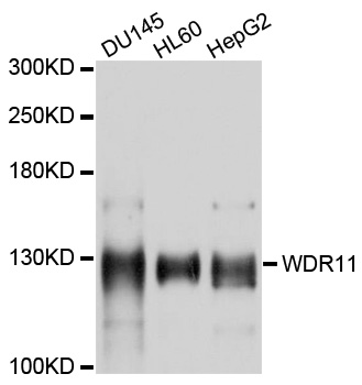 Western blot analysis of extracts of various cell lines, using WDR11 antibody at 1:1000 dilution.Secondary antibody: HRP Goat Anti-Rabbit IgG (H+L) at 1:10000 dilution.Lysates/proteins: 25ug per lane.Blocking buffer: 3% nonfat dry milk in TBST.Detection: ECL Basic Kit .Exposure time: 30s.