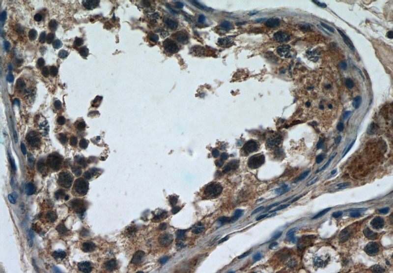 Immunohistochemistry of paraffin-embedded human testis tissue slide using Catalog No:116856(WDR16 Antibody) at dilution of 1:50 (under 40x lens)