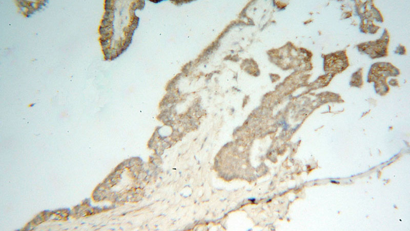 Immunohistochemical of paraffin-embedded human ovary tumor using Catalog No:116857(WDR18 antibody) at dilution of 1:100 (under 40x lens)