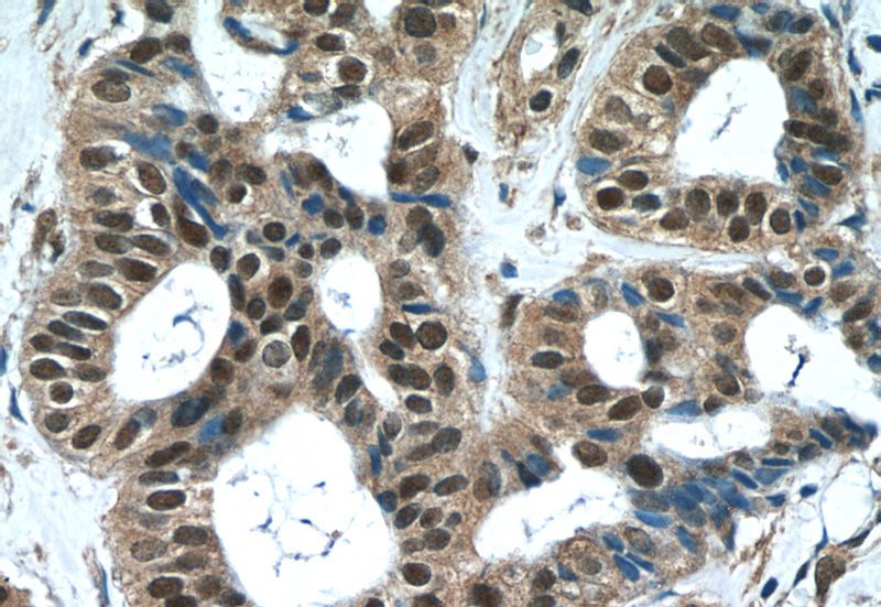 Immunohistochemistry of paraffin-embedded human breast cancer tissue slide using Catalog No:116865(WDR38 Antibody) at dilution of 1:50 (under 40x lens)