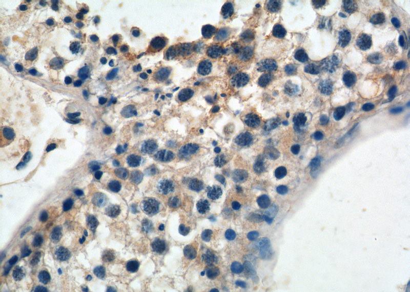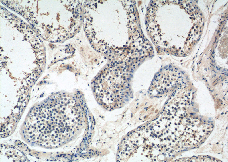 Immunohistochemistry of paraffin-embedded human testis tissue slide using Catalog No:116867(WDR40A Antibody) at dilution of 1:50 (under 40x lens)