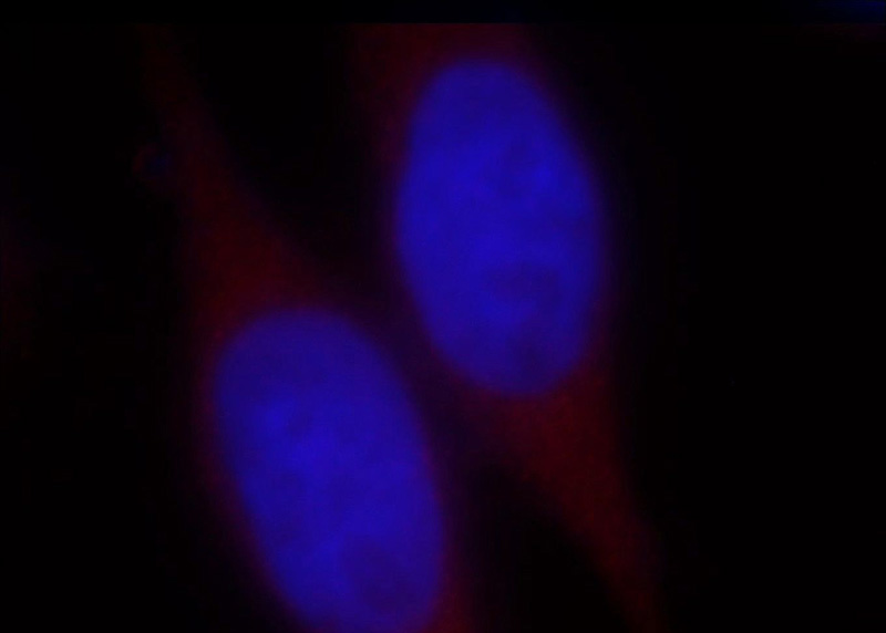Immunofluorescent analysis of Hela cells, using WDR45 antibody Catalog No:116868 at 1:25 dilution and Rhodamine-labeled goat anti-rabbit IgG (red). Blue pseudocolor = DAPI (fluorescent DNA dye).