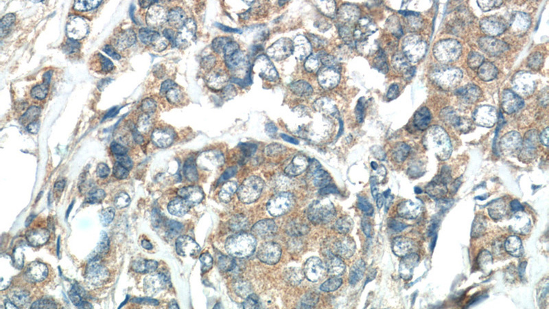 Immunohistochemistry of paraffin-embedded human breast cancer tissue slide using Catalog No:116821(WFDC1 Antibody) at dilution of 1:50 (under 40x lens)