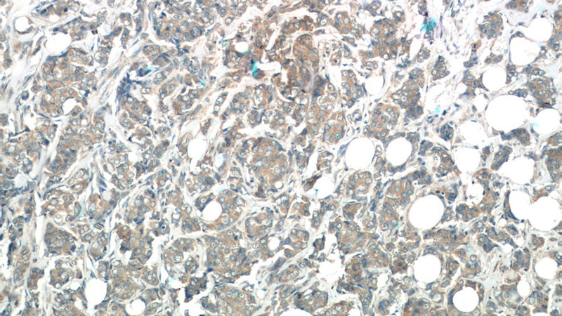 Immunohistochemistry of paraffin-embedded human breast cancer tissue slide using Catalog No:116821(WFDC1 Antibody) at dilution of 1:50 (under 10x lens)