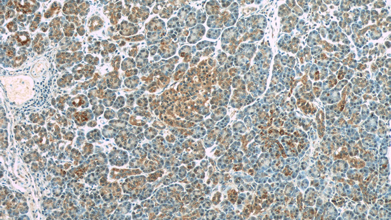 Immunohistochemistry of paraffin-embedded human pancreas tissue slide using Catalog No:116823(WFDC3 Antibody) at dilution of 1:50 (under 10x lens)