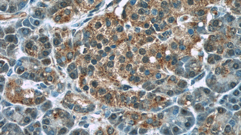 Immunohistochemistry of paraffin-embedded human pancreas tissue slide using Catalog No:116823(WFDC3 Antibody) at dilution of 1:50 (under 40x lens)