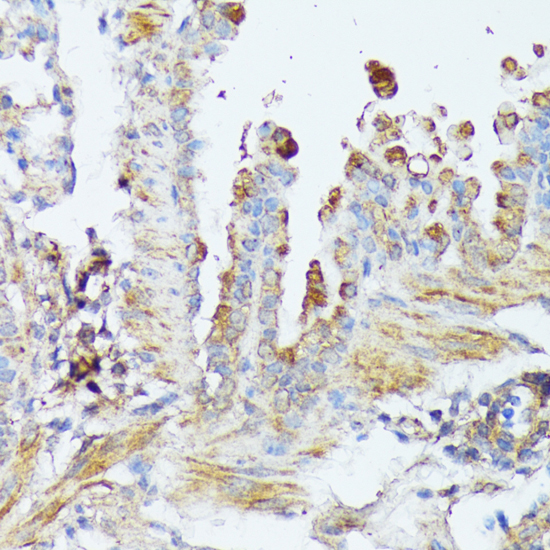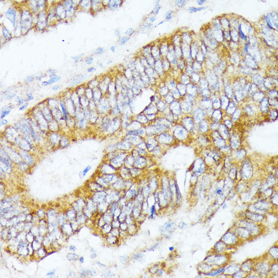 Immunohistochemistry of paraffin-embedded human colon carcinoma using WNT1 antibody at dilution of 1:100 (40x lens).
