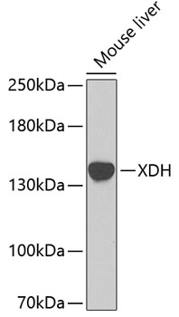Western blot analysis of extracts of mouse liver, using XDH antibody .Secondary antibody: HRP Goat Anti-Rabbit IgG (H+L) at 1:10000 dilution.Lysates/proteins: 25ug per lane.Blocking buffer: 3% nonfat dry milk in TBST.