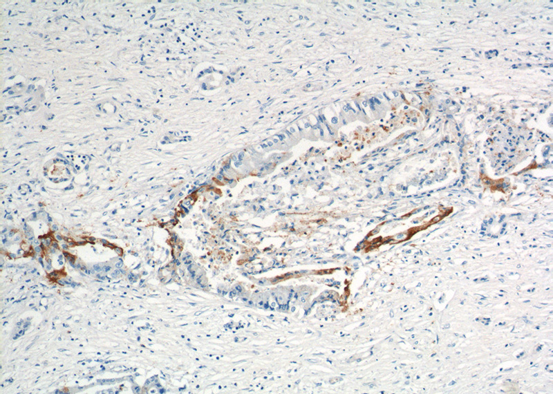 Immunohistochemistry of paraffin-embedded human pancreas cancer tissue slide using Catalog No:116988(XK Antibody) at dilution of 1:200 (under 40x lens).