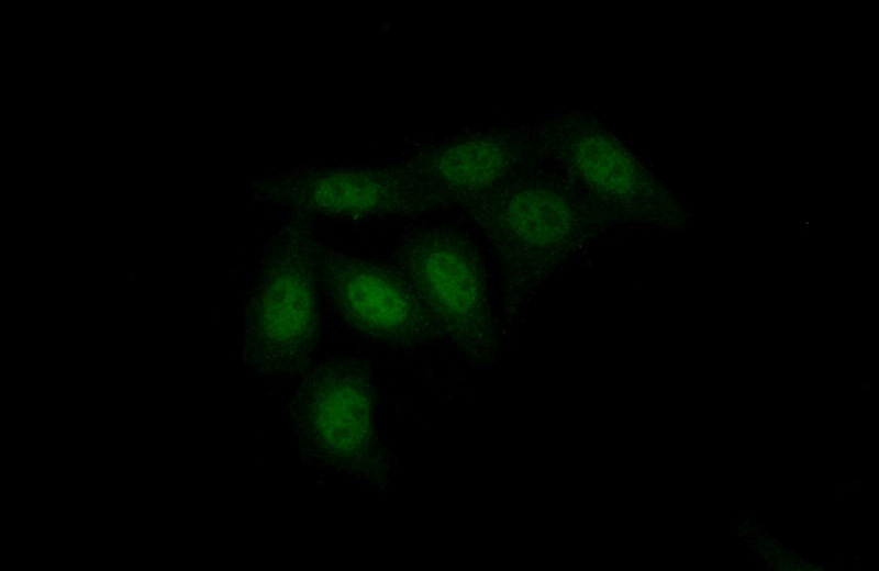 Immunofluorescent analysis of (10% Formaldehyde) fixed HepG2 cells using Catalog No:116991(XPA Antibody) at dilution of 1:50 and Alexa Fluor 488-congugated AffiniPure Goat Anti-Rabbit IgG(H+L)