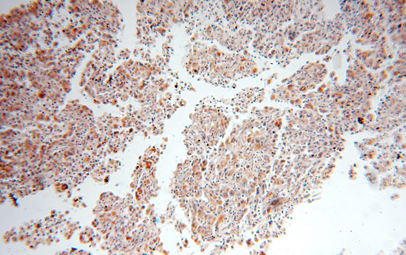 Immunohistochemical of paraffin-embedded human lung cancer using Catalog No:116993(XPNPEP3 antibody) at dilution of 1:100 (under 10x lens)